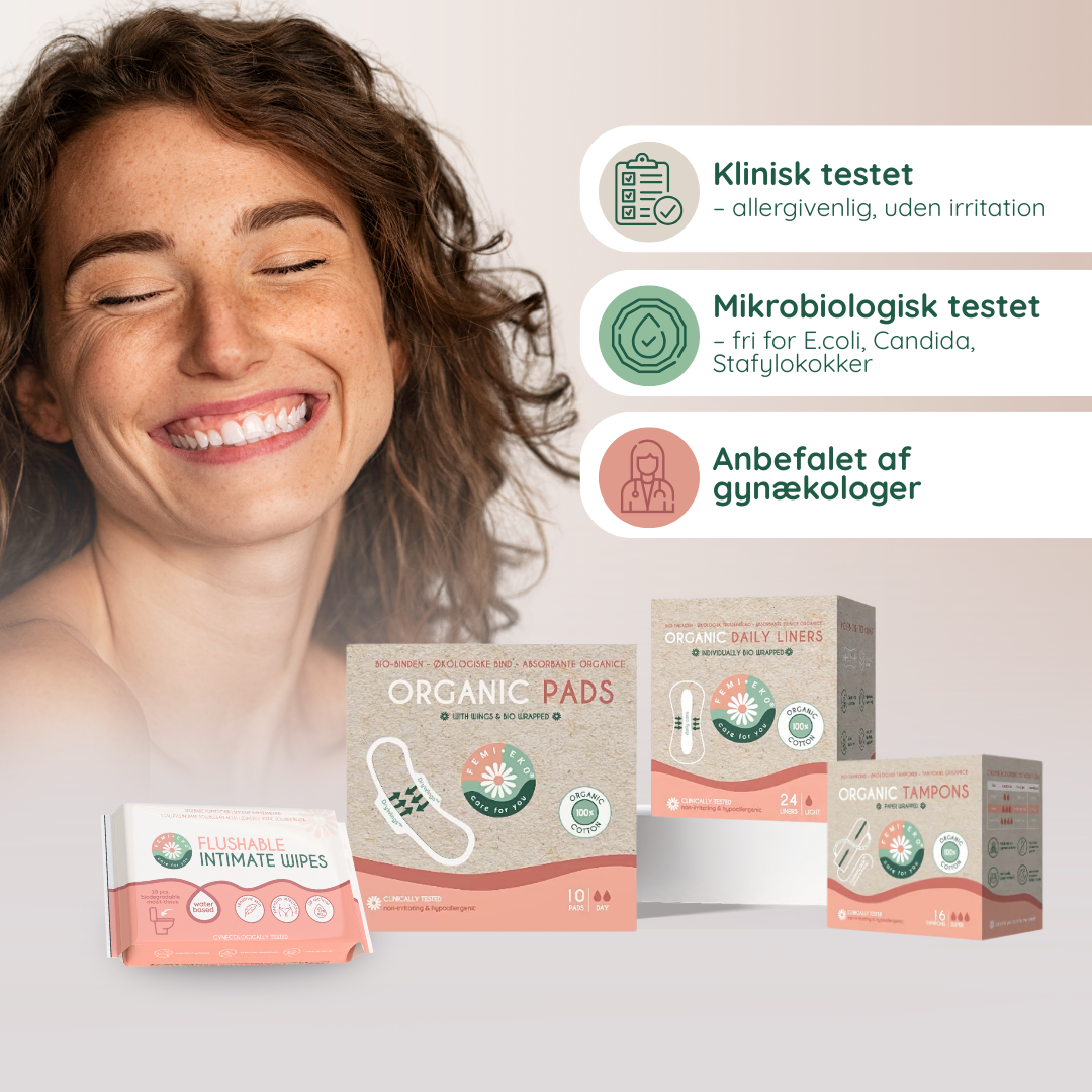 – er individuelt indpakket, hygiejniske og i biologisk nedbrydelige materialerProdukterne er udviklet til at give sikker beskyttelse og naturlig komfort, uden at gå på kompromis med sundhed eller bæredygtighed.